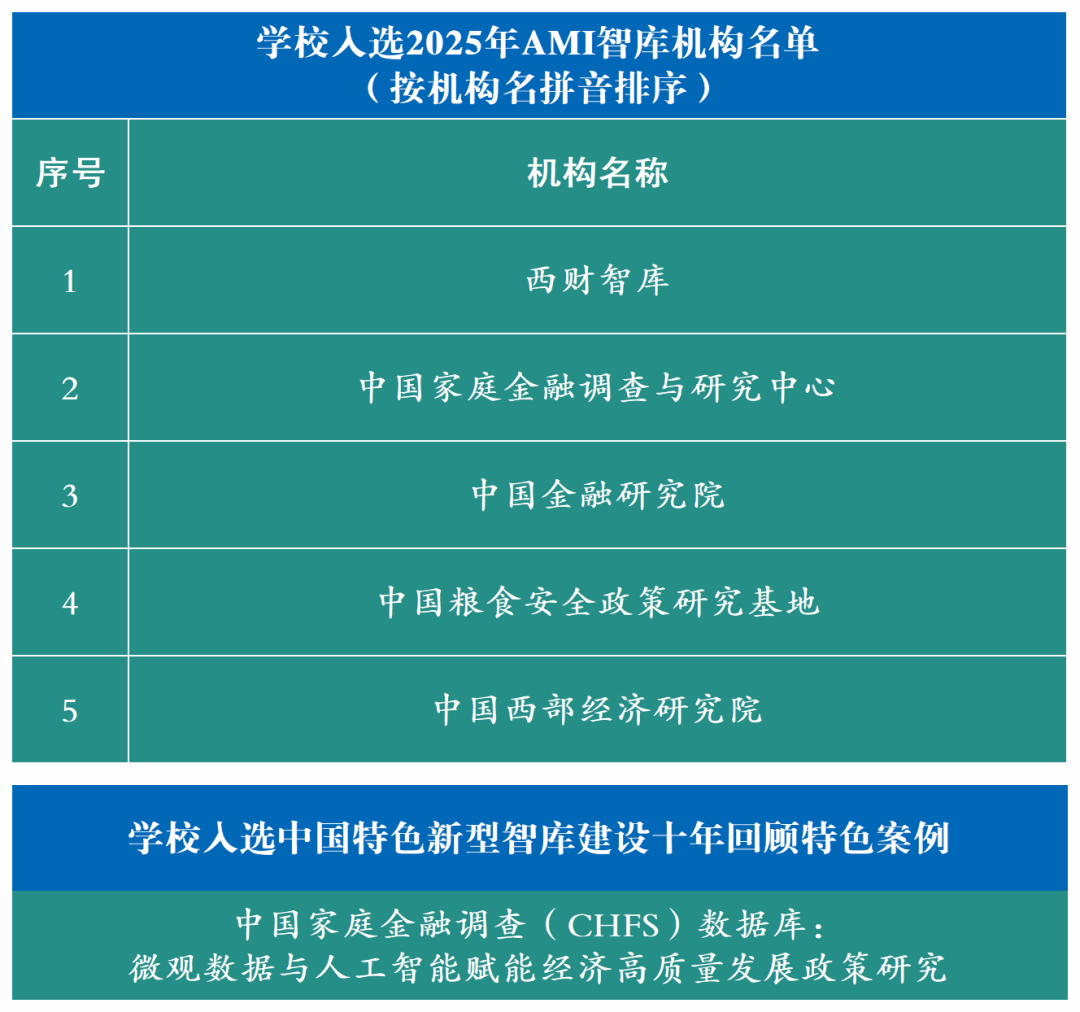 近日,中国社会科学评价研究院正式公布2025年中国智库综合评价研究项目(AMI)评审结果,四川省9家机构入选,其中5家来自西南财经大学。同时,学校一项案例入选“中国特色新型智库建设十年回顾特色案例”。