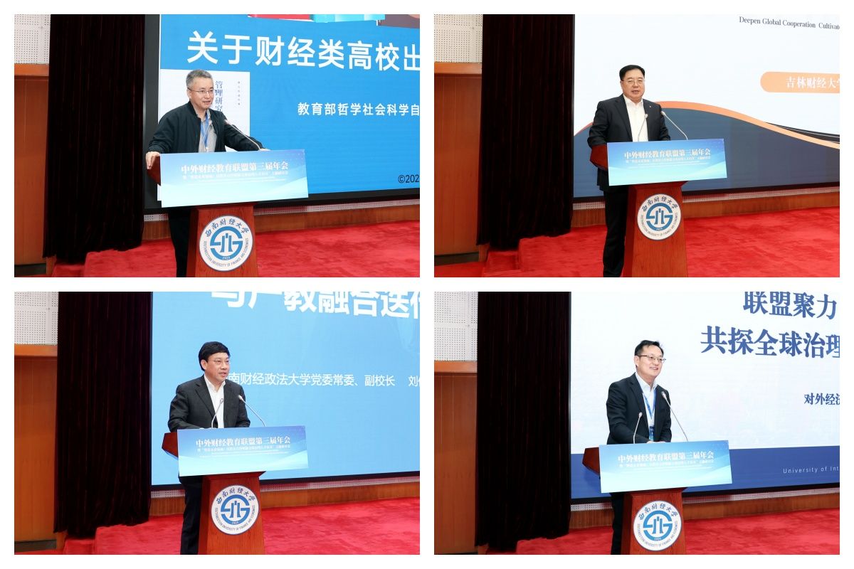 浙江工商大学党委副书记、校长王永贵,吉林财经大学党委书记张炳辉,中南财经政法大学党委常委、副校长刘仁山,对外经济贸易大学党委常委、副校长陈德球分别围绕财经大学高质量发展、深耕国际合作、学科交叉与产教融合以及联盟合力教育赋能等作精彩主旨发言。江西财经大学党委常委、副校长袁红林,上海对外经贸大学党委常委、副校长徐永林,贵州财经大学党委常委、副校长杜剑,河北金融学院党委常委、副校长韩景旺,澳门科技大学协理副校长梁文慧,缅甸国家管理学位学院校长钦·蒂达·尼因(Khin Thida Nyein),巴西伯南布哥大学中心主任阿德米尔·马塞多·纳西门托(Ademir Macedo Nascimento)等嘉宾围绕教育国际交流合作与全球治理人才培养等分享前瞻性思考和宝贵经验。学校党委常委、副校长李志生,东北财经大学党委常委、副校长施锦芳主持开幕式及主旨论坛。